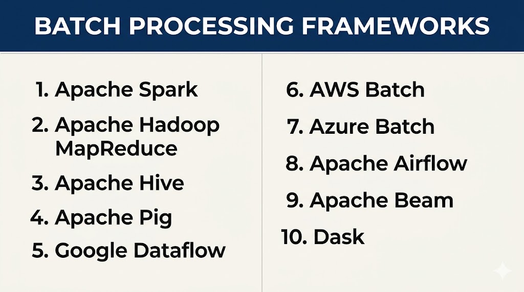 Batch processing frameworks are systems designed to process large volumes of data in groups (batches) rather than in real time. Instead of handling data as it arrives, these frameworks collect data over a period and process it at scheduled intervals. This approach is ideal for workloads that require heavy computation, historical analysis, and cost-efficient data processing.