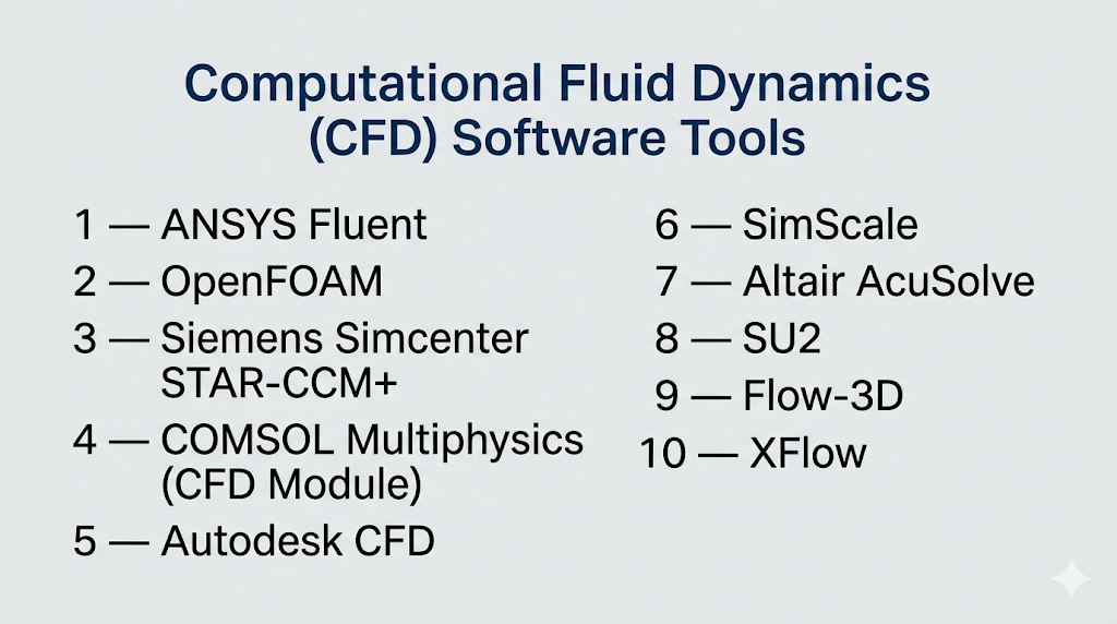 Computational Fluid Dynamics (CFD) software is used to simulate and analyze how fluids (liquids and gases) behave under different physical conditions. These tools solve complex equations governing fluid flow, heat transfer, turbulence, and chemical reactions—allowing engineers to visualize and predict real-world performance without physical testing.