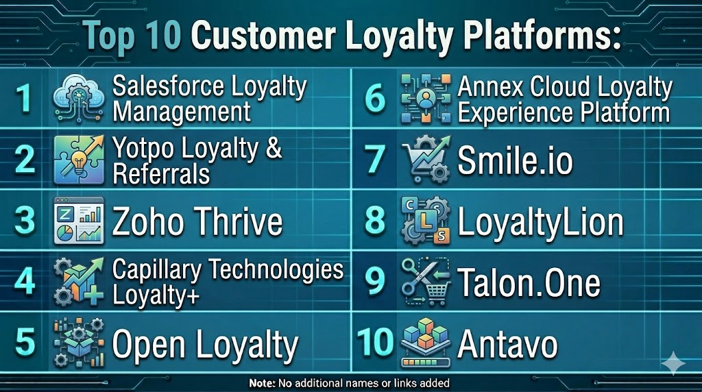 Customer Loyalty Platforms have become essential tools for businesses looking to retain customers and maximize lifetime value in a competitive market. These platforms go far beyond simple rewards programs by leveraging data, AI, and automation to create personalized and engaging customer experiences. From easy-to-use solutions like Smile.io to enterprise platforms like Salesforce and Talon.One, each tool offers unique strengths depending on business size and complexity. The right choice depends on your customer engagement strategy, integration needs, and scalability goals rather than a one-size-fits-all solution. Businesses should prioritize personalization, analytics, and omnichannel capabilities when selecting a platform. A practical next step is to shortlist a few tools, test loyalty campaigns, and evaluate their impact on retention and revenue before full implementation.