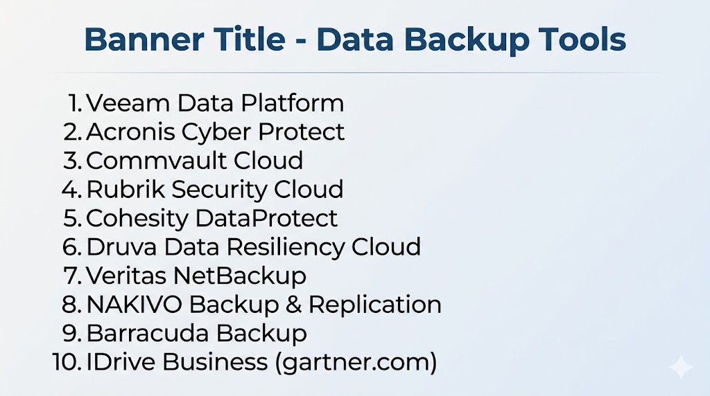 Data Backup Tools are no longer optional for businesses that rely on digital operations. The best platforms protect critical information, reduce downtime risk, and provide confidence during cyber incidents or system failures. Veeam remains a strong all-around leader, while Rubrik and Cohesity excel in enterprise resilience. Acronis, IDrive, and NAKIVO deliver excellent value for growing teams, while Druva stands out for cloud-native simplicity. The right choice depends on your workloads, compliance requirements, recovery goals, and budget. Shortlist two or three tools, run a pilot, and validate restore speed, reporting, and management simplicity before making a final decision.