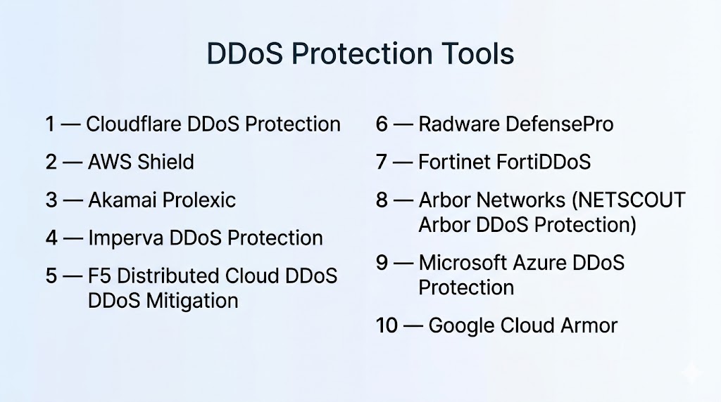 From cloud-native solutions like Cloudflare and AWS Shield to enterprise-grade platforms like Akamai, Imperva, and F5, organizations have a wide range of options depending on scale and complexity.