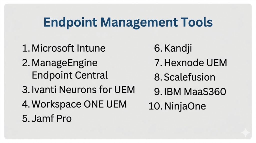 Endpoint Management Tools are now essential for organizations running hybrid, remote, and security-focused environments. The best platforms centralize device control, automate patching, enforce compliance, and reduce IT workload. Microsoft Intune and Workspace ONE lead in enterprise depth, while ManageEngine, Hexnode, and NinjaOne deliver strong value for growing teams. Apple-focused businesses should closely evaluate Jamf Pro or Kandji. The best choice depends on your device mix, internal expertise, compliance needs, and budget. Shortlist two or three tools, run a pilot, and validate integrations, usability, and security controls before making a final decision.