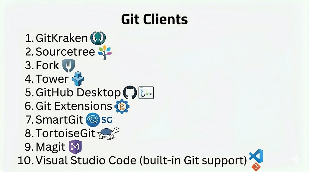 Git Clients are standalone applications or interfaces that make interacting with Git repositories easier and more visual for developers. While Git itself is a command‑line tool, Git clients offer graphical interfaces, visualization of branches, commit history, staging panels, merge tools, and advanced integrations. They help users manage version control tasks more efficiently without memorizing command‑line syntax.