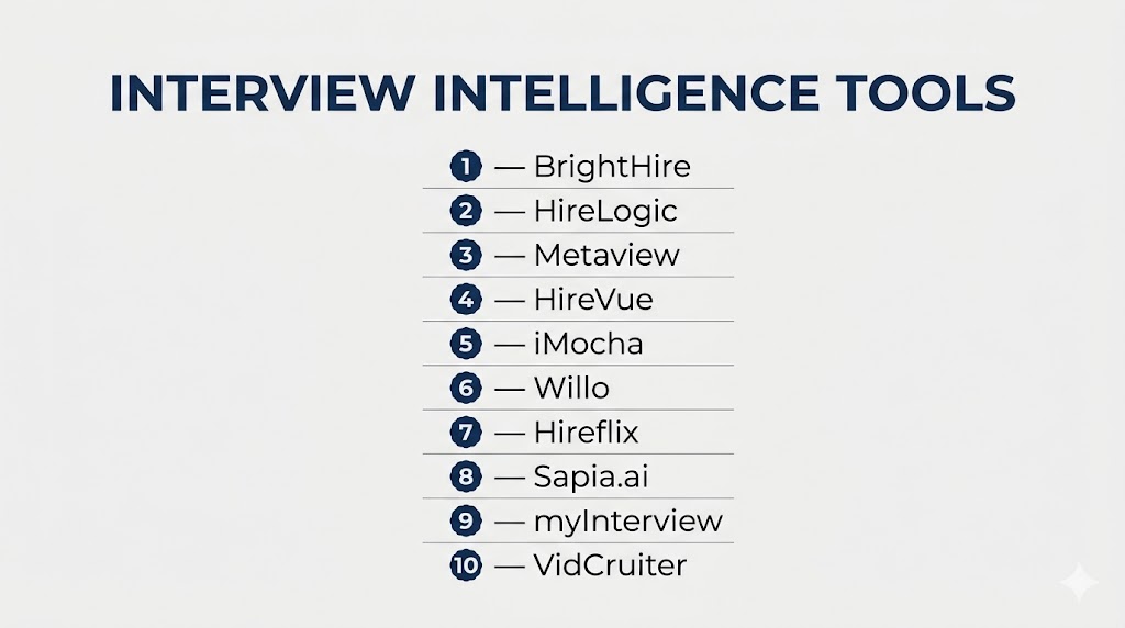 Interview Intelligence Tools are AI-powered platforms designed to analyze, record, and improve the interview process by capturing conversations, generating insights, and standardizing hiring decisions. These tools use technologies like speech-to-text, natural language processing, and machine learning to transcribe interviews, highlight key moments, and provide structured feedback to recruiters and hiring managers.