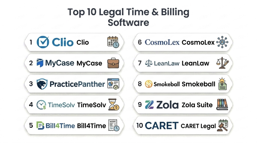 Legal Time & Billing Software helps law firms and legal departments track billable hours, manage client invoicing, automate billing processes, and gain real-time visibility into financial performance. These tools replace manual timekeeping and spreadsheet‑based billing with automated workflows, reducing errors and increasing revenue capture.