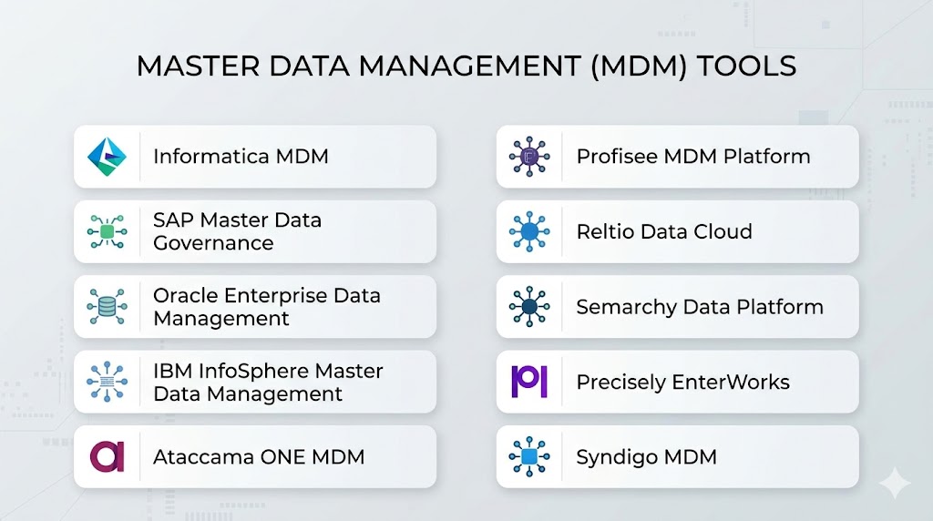 MDM tools help manage core business data such as customers and products. They ensure consistency across systems. They improve data quality. They support governance.
