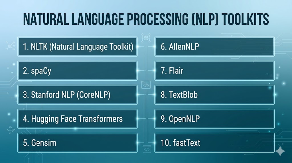 Natural Language Processing (NLP) toolkits are software libraries and frameworks that help developers and data scientists process, analyze, and understand human language. These toolkits provide pre-built components for tasks like tokenization, sentiment analysis, named entity recognition, text classification, and language modeling.