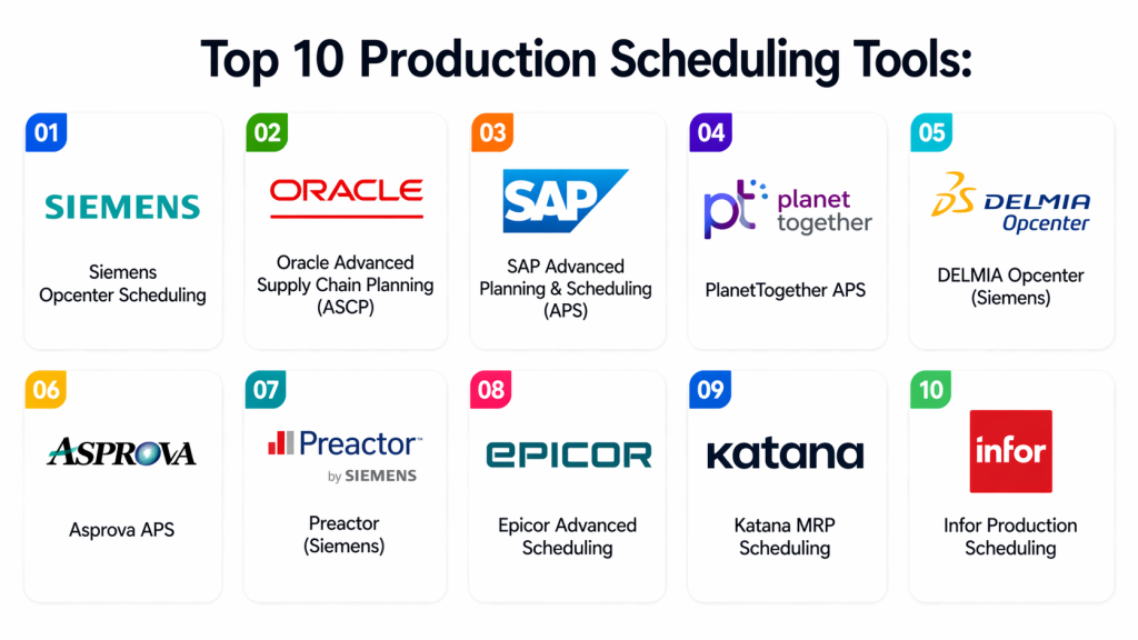 Production Scheduling Tools are essential for modern manufacturing environments, enabling businesses to efficiently manage production workflows, reduce delays, and optimize resource utilization. They play a critical role in ensuring smooth operations across factories and supply chains. There is no single best tool for every organization. Enterprises often rely on SAP, Siemens, or Oracle for large-scale scheduling, while mid-sized manufacturers use tools like PlanetTogether or Epicor. Smaller businesses benefit from simpler solutions like Katana. The right choice depends on production complexity, integration needs, and scalability requirements. Companies should evaluate tools based on real-time capabilities, integration strength, and ease of use. Start by testing a few platforms, analyzing scheduling efficiency, and validating integration with existing systems to ensure long-term operational success.