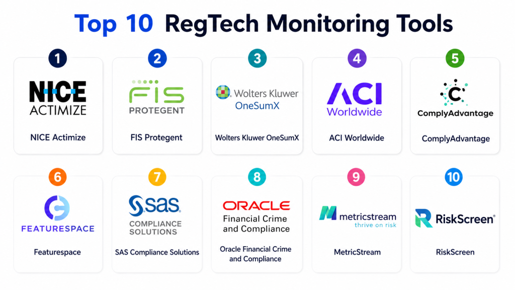 RegTech Monitoring Tools are specialized compliance technology platforms that help organizations automate regulatory monitoring, detect suspicious activity, manage risk exposure, and maintain audit-ready compliance workflows. Instead of relying on spreadsheets, manual reviews, and fragmented reporting systems, businesses can use RegTech platforms to continuously monitor transactions, communications, internal controls, and regulatory obligations in real time.