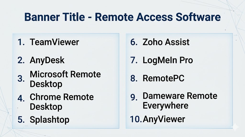 Remote Access Software has become essential for modern work environments, enabling seamless connectivity, IT support, and productivity from anywhere. The best tools balance performance, security, ease of use, and cost. TeamViewer remains a top enterprise choice, while AnyDesk offers excellent performance. Microsoft Remote Desktop is ideal for Windows environments, and Chrome Remote Desktop is perfect for simple use cases. Splashtop and Zoho Assist provide strong value for SMBs. The right choice depends on your technical needs, team size, security requirements, and budget. Shortlist two or three tools, test performance, and validate security controls before making a final decision.