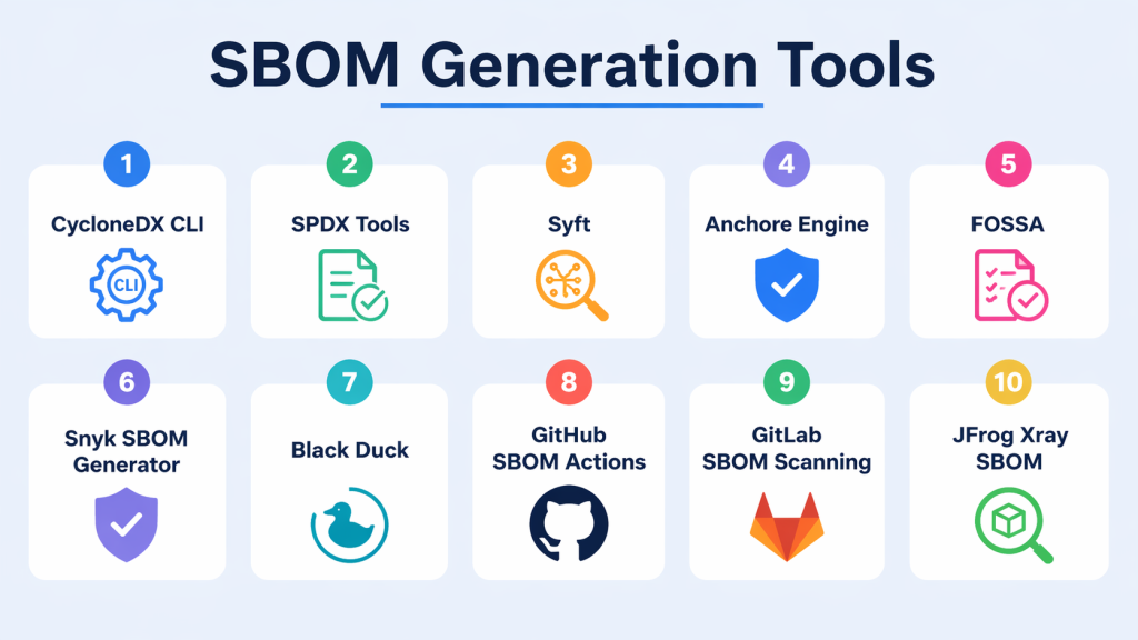 CycloneDX CLI, SPDX Tools, or Syft for lightweight and standards‑compliant SBOMs.