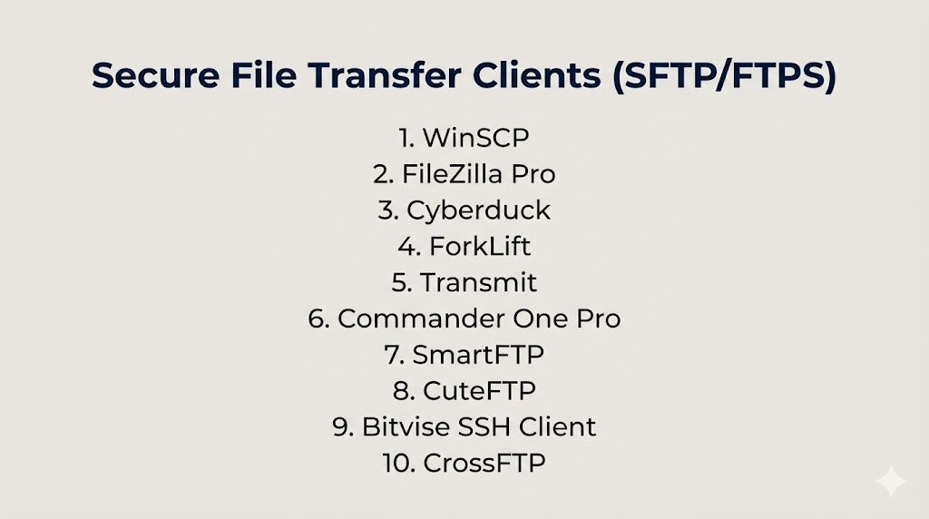 Secure File Transfer Clients (SFTP/FTPS) are essential for teams that move files to servers safely and efficiently. The best choice depends on your operating system, technical needs, and workflow style. WinSCP remains a top Windows option, FileZilla Pro is strong cross-platform, Cyberduck excels for Mac and cloud workflows, while Transmit and ForkLift appeal to premium macOS users. IT admins may prefer Bitvise for advanced SSH control. Shortlist two or three tools, test transfer speed, automation, and usability, then choose the one that fits your daily workflow best.