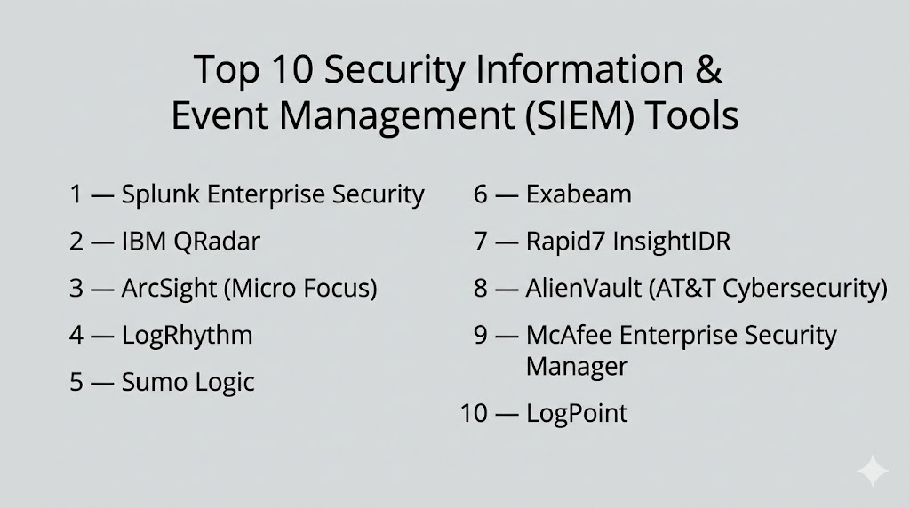 Splunk, IBM QRadar, and McAfee Enterprise Security Manager deliver advanced analytics, scalability, and multi-source integration.