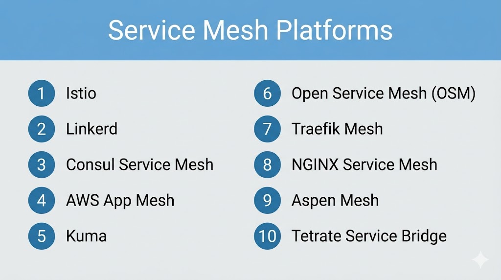 Service Mesh Platforms are critical for managing communication, security, and observability in modern microservices architectures. Istio leads in features and enterprise capabilities, while Linkerd offers simplicity and performance. Consul and Kuma provide strong multi-cloud flexibility, and managed options like AWS App Mesh reduce operational overhead. Enterprise platforms like Tetrate and Aspen Mesh deliver advanced control and scalability. The right choice depends on your infrastructure complexity, security needs, and team expertise. Start with a lightweight solution if you’re new, and scale to advanced platforms as your architecture evolves.